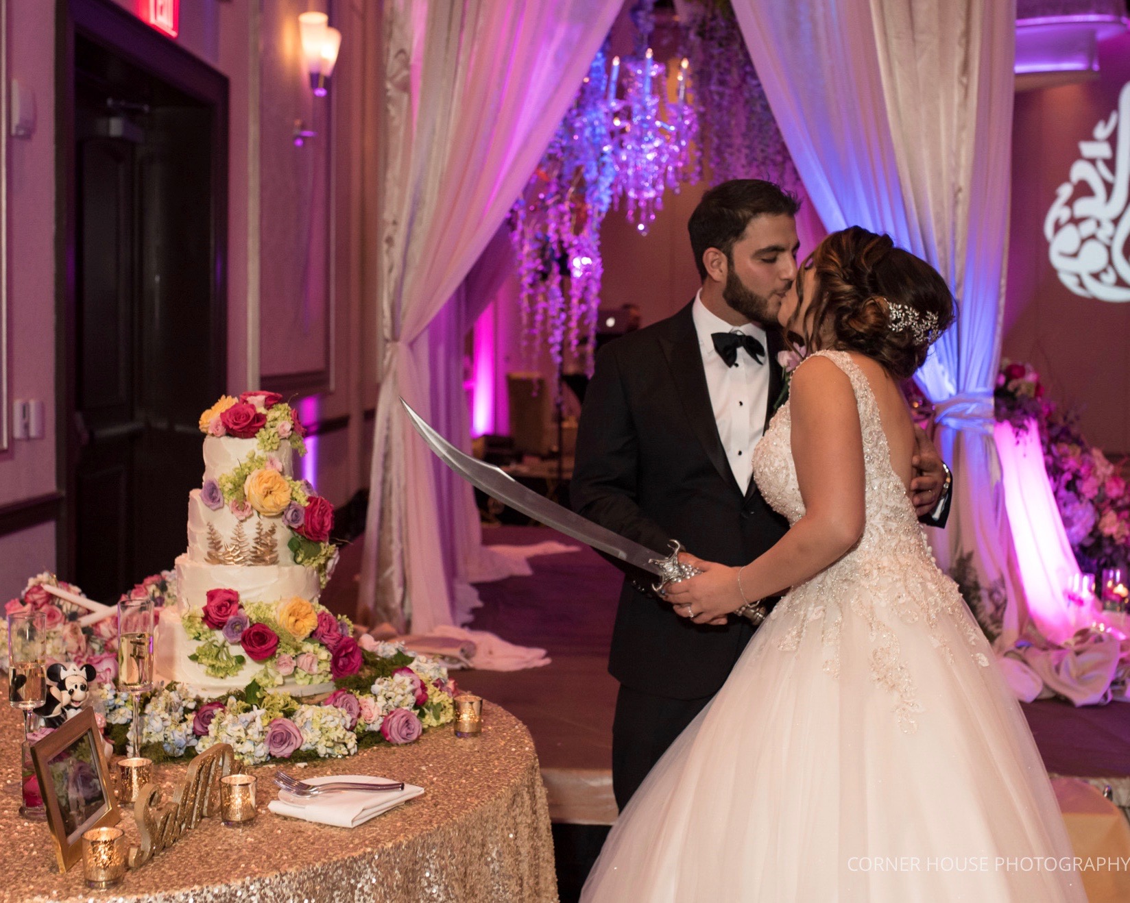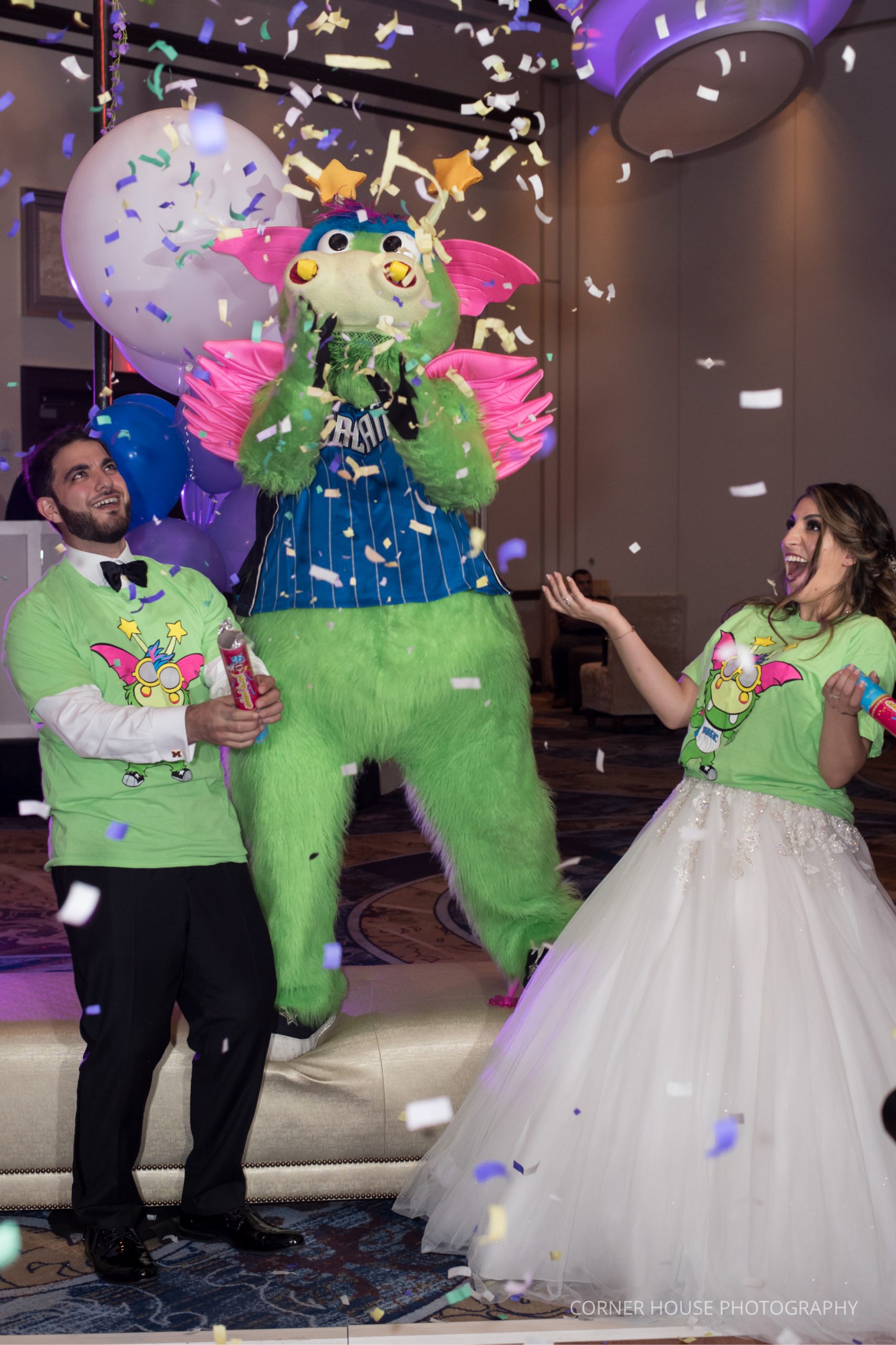 Leaning her back for a kiss ended the dance before dinner and another ceremonial dance of a candle lighting. Their cake cutting was done by sword, which of course had rhinestones on the handle! Back to the grand surprise of the evening, and one of our most favorite events, Stuff! Stuff from the Orlando Magic made quite the bang with confetti poppers as he entered the room. Immediately going in for the biggest hug with our bride and groom, guests were in complete shock and excitement of seeing the Orlando Magic mascot.