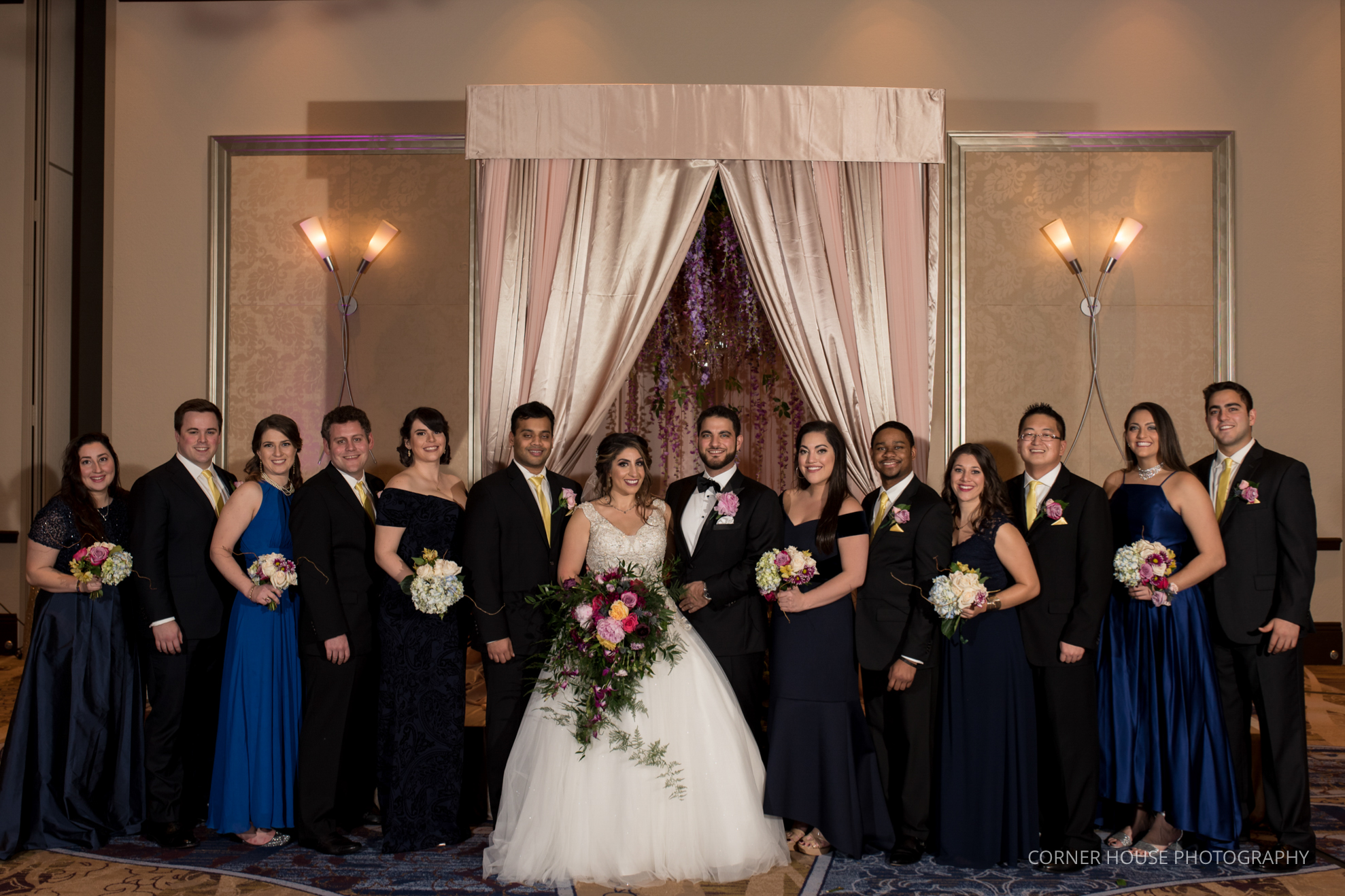 Newlywed portraits throughout the property from the ‘castle’ to a secret garden made for a beautiful backdrop before we headed back inside for formal portraits with their wedding party and family. Dandy Details Events & Design created a stunningly beautiful pink, purple, and gold room that was filled with sparkle and glitter. Formal portraits took place in front of the sweetheart table that was surrounded by a arch of flowers hanging down.